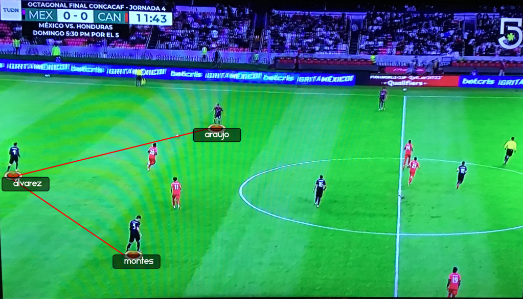 Es muy común ver este tipo de movimientos en Edson, sabe cuando incorporarse a la línea defensiva y cuando fijar rivales para que sus centrales tengan más tiempo y espacio en la salida. En este juego se vio constantemente a Álvarez meterse entre Montes y Araujo para iniciar la salida del equipo Mexicano, formando así un 3-4-3, con esto permitía a Gallardo y Sánchez que adelantaran su posición y darle amplitud al equipo. Además que se generaba una superioridad numérica de 3 a 2 contra la primera línea de presión rival.