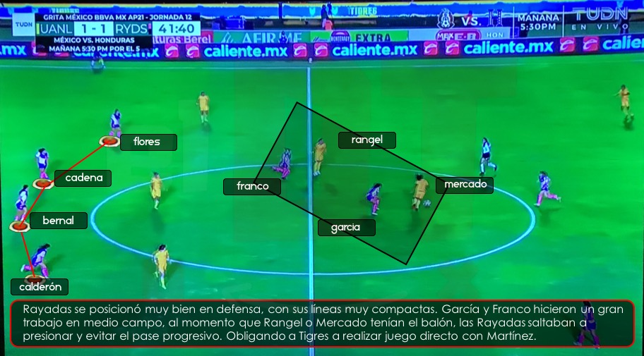 En Tigres femenil se sabe que las generadoras de juego son las mediocampistas, tanto Mercado como Nayeli Rangel, en la transición ofensiva, que es justo ese momento inmediato de recuperar el balón, las mediocampistas buscan que el primer pase sea a las bandas, tanto con Ovalle por izquierda o con María Sánchez por derecha. Eva Espejo consiente de eso, mandó una marca casi personal, en el momento que Nayeli o Mercador tuvieran el balón García y Franco saltaban de su zona y hacían presión, con esto obligaban a que Tigres retrocediera el balón y las centrales realizaran juego directo, saltaran líneas y buscara en el eje del ataque a Katty Martínez.
