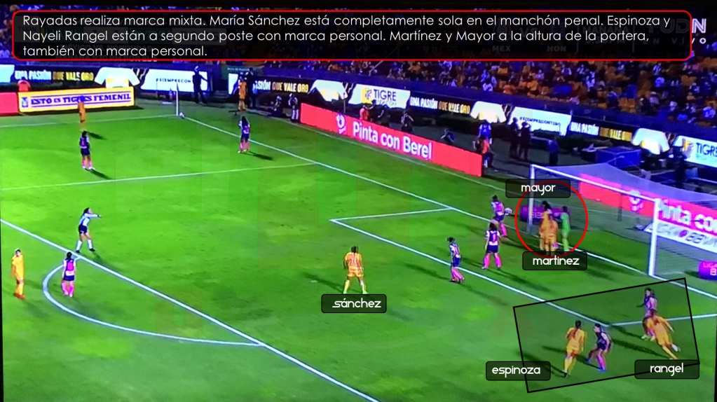 En el futbol existen tres formas de defender el balón parado, marca personal, marca en zona y marca mixta. Rayadas decidió hacer marca mixta, la cual consiste en dos jugadoras o tres, marcan a las rivales con mejor juego aéreo, y el resto ocupa una zona determinada. Las marcas que se hicieron personales fueron las mas cercanas a la portería y que terminaron por obstaculizar a la portera Alejandría Godínez. Mercado intentó un centro cerrado que alcanzó a desviar Godínez pero el rebote le quedó a Greta Espinoza que llegó completamente sola a empujar el balón.