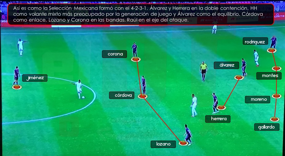 A lo largo del proceso de Gerardo Martino al frente de la Selección Mexicana, el sistema que más ha utilizado es el 4-3-3, para este encuentro, el “Tata” decidió hacer una variante y formar con un 4-2-3-1, un sistema que entre sus virtudes está el juego entre líneas. En la doble contención formó con Edson Álvarez, quién hacía más funciones defensivas y de equilibrio del equipo y con Héctor Herrera cumpliendo las funciones de un volante mixto, más preocupado y ocupado en la generación de juego. En banda estaban Hirvin Lozano y Jesús Corona por izquierda y derecha respectivamente. Formando como media punta estaba Córdova, jugando entre líneas y pisando constantemente al área con mucho acompañamiento a Raúl Jiménez.