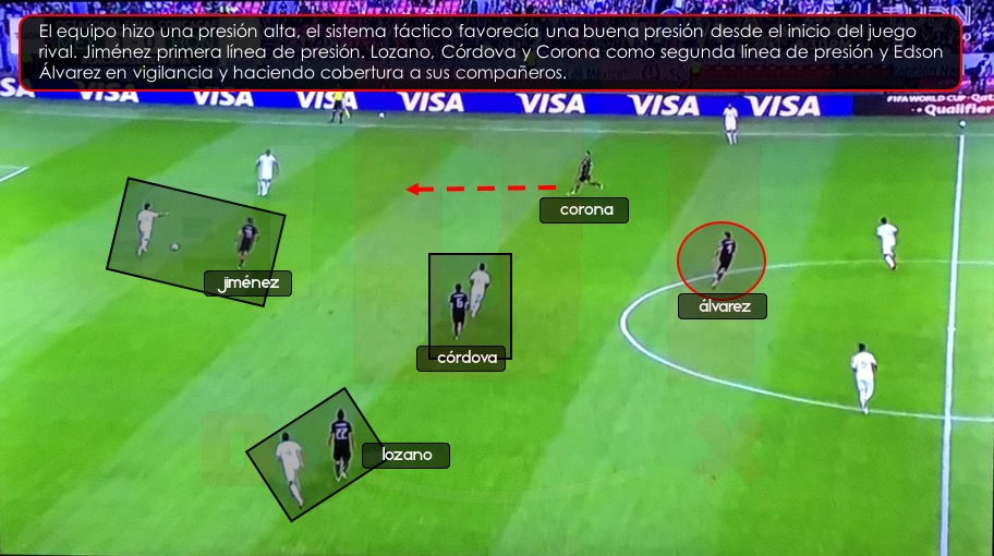 Una de las áreas de oportunidad del equipo en el partido pasado fue la falta de presión en el momento del inicio del juego del rival, y echar el equipo para atrás, el mismo Martino lo reconoció en la conferencia de prensa post partido. Para este encuentro, la idea fue diferente, y el sistema 4-2-3-1, favorece esa presión alta, ya que se contaba con Jiménez como primera línea de presión, cercano a él, estaba la segunda línea de presión con Lozano, Córdova y Corona, y haciendo cobertura y vigilancia Herrera y Álvarez.