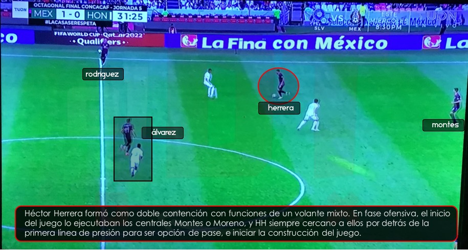 La formación del 4-2-3-1, permitía a Héctor Herrera convertirse en el generador del juego. En fase ofensiva, en la etapa de inicio del juego, el equipo mexicano buscaba por derecha con Montes o por izquierda con Moreno llevar el balón a banda, y ahí caía Héctor Herrera para recibir entre líneas y así eliminar a la primera línea de presión del rival para empezar con la construcción del juego.