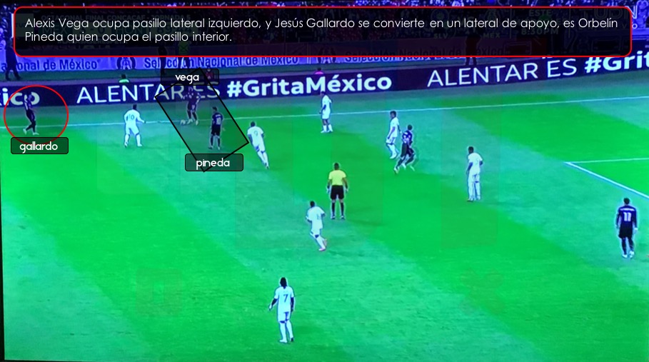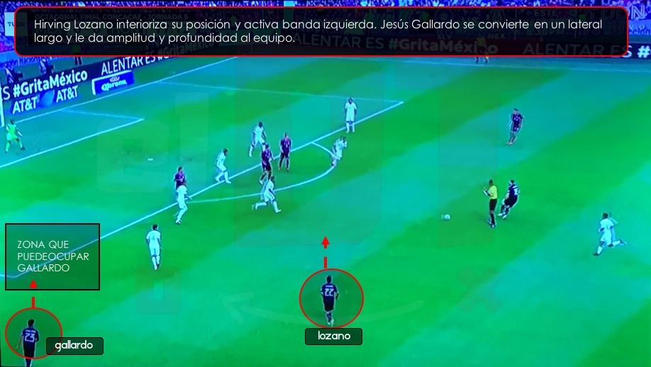 Cuando Hirving se quedaba pegado a la banda para alargar la línea defensiva rival, Jesús Gallardo se queda como lateral de apoyo, es decir, no se incorporaba al ataque, quien ocupaba pasillo interior era Córdova o Héctor Herrera. Y en el segundo tiempo, aun y con los cambios de jugadores, esta función de Gallardo se mantuvo. Alexis Vega en amplitud pegado a la banda, Gallardo de lateral de apoyo y Orbelín Pineda ocupando pasillo interior.