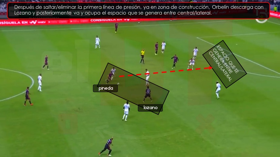 En la fase de construcción ya se eliminó la primera línea de presión y Romo dio un pase progresivo a Orbelín quien se encontraba entre líneas como opción de pase, cercano a él está Hirving Lozano. Orbelín descarga con la única opción de pase que tiene (Lozano) y posteriormente hace un movimiento en diagonal al espacio que se genera entre defensa central izquierdo y lateral izquierdo en referencia a la defensiva de Honduras.