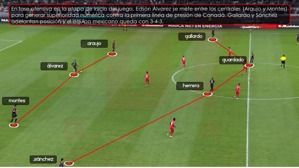 En este momento de la fase ofensiva, Edson Álvarez toma un rol protagónico, ya que es quien se mete entre los dos centrales (Araujo y Montes) para formar la línea de tres circunstancial y así hacer una superioridad numérica de 3 a 2 contra la primera línea de presión de Canadá, ellos formaron con un 4-4-2. Con el movimiento de Edson, el equipo adopta un 3-4-3, los laterales Sánchez y Gallardo por derecha e izquierda respectivamente adelantan su posición y se colocan a la altura de los interiores (Guardado y Herrera) que ahora forman la doble contención.