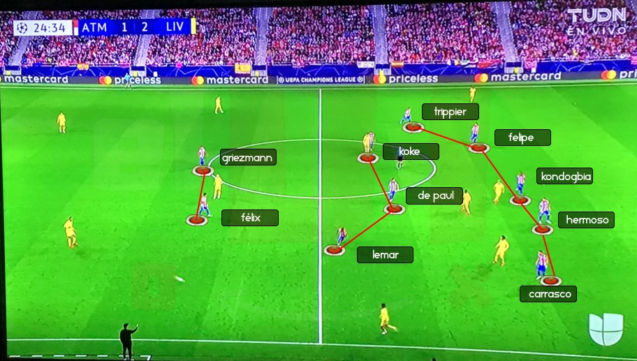 Simeone paró a su equipo para ser más reactivo, es decir, jugar sin balón y a la recuperación buscar el ataque directo y vertical. Es por eso que en la fase ofensiva del Liverpool en la etapa del inicio del juego, la primera línea de presión del Atlético (Griezmann y Félix) no presionaban, sino que simplemente hacían una marca de referencia, e iban retardando la jugada y el equipo completo iba retrocediendo cerrando espacios. El bloque defensivo cerraba pasillo central y orientaba el ataque a pasillos laterales, una vez que el balón entraba a esa zona, empezaba una presión constante para recuperar el balón y atacar directo.