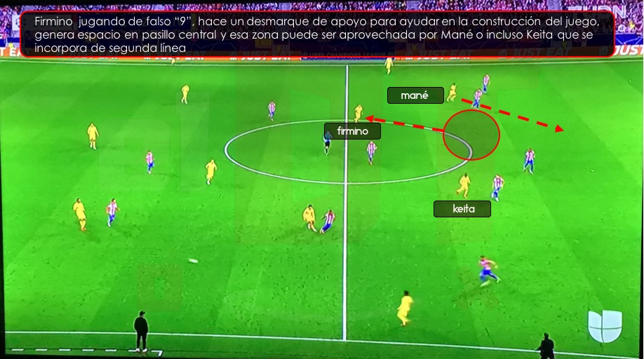 Uno de los movimientos característicos del equipo de Klopp es que Roberto Firmino juega de falso “9”, es decir, en la fotografía inicial aparece cómo centro delantero, pero conforme va avanzando el ataque “red” Firmino empieza hacer movimientos sin balón. Este, generalmente se da cuando el equipo está en la etapa de la construcción del juego, es decir, cuando el equipo ya brincó/eliminó la primera línea de presión rival. Firmino hace un desmarque de apoyo para ser opción de pase y la zona que deja el delantero es ocupada por Mané o Salah que hacen movimientos en diagonal, o bien, por algún compañero que se incorpore de segunda línea.