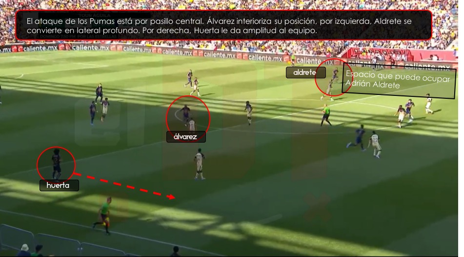 Pumas formó con un 4-4-2, el pasillo lateral izquierdo estaba formado por Adrián Aldrete de lateral y Favio Álvarez de mediocampista. Cuando el ataque de los Universitarios se generaba por banda izquierda, Favio interiorizaba su posición para asociarse principalmente con Leo López en pasillo central, y activar por pasillo lateral a Aldrete, y que este le diera amplitud y profundidad al equipo.