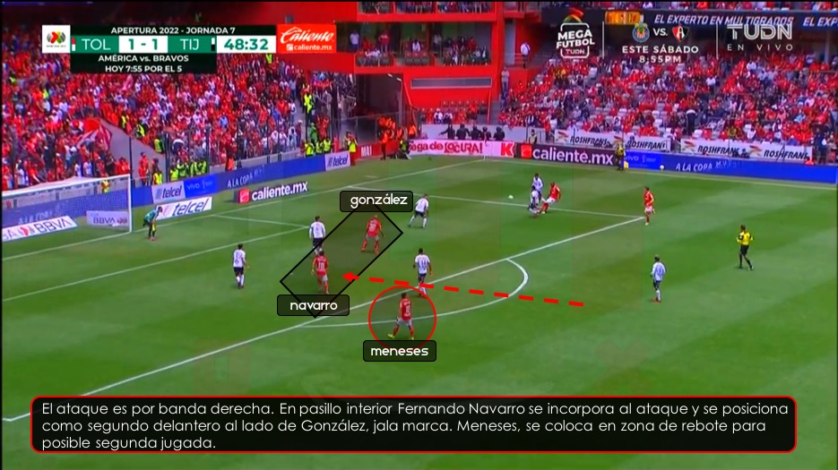 El balón se encuentra en pasillo lateral derecho en referencia al ataque del Toluca, por el otro lado, por pasillo interior izquierdo, Fernando Navarro atrae marca, se incorpora al ataque de segunda línea y se posiciona como segundo delantero en el área al lado de Carlos González. En zona de rebote queda Jean Meneses para aprovechar zona de rebote y ganar la segunda jugada. El centro viene directo a él y remata completamente solo a portería.