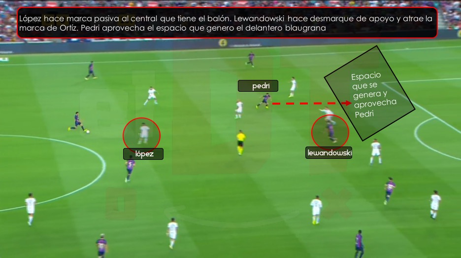 Lewandowski hace un desmarque de apoyo, es decir, sale de su posición y hace un movimiento hacia su compañero para ser opción de pase. Este movimiento generalmente busca una, ser opción de pase y dos, atraer rivales para generar espacio que pueda ser aprovechado por compañeros que se incorporan de segunda línea. Con este movimiento de Lewandowski es Ortiz el que lo sigue, y el espacio que dejó el Polaco lo aprovechó Pedri que se incorporó de segunda línea.