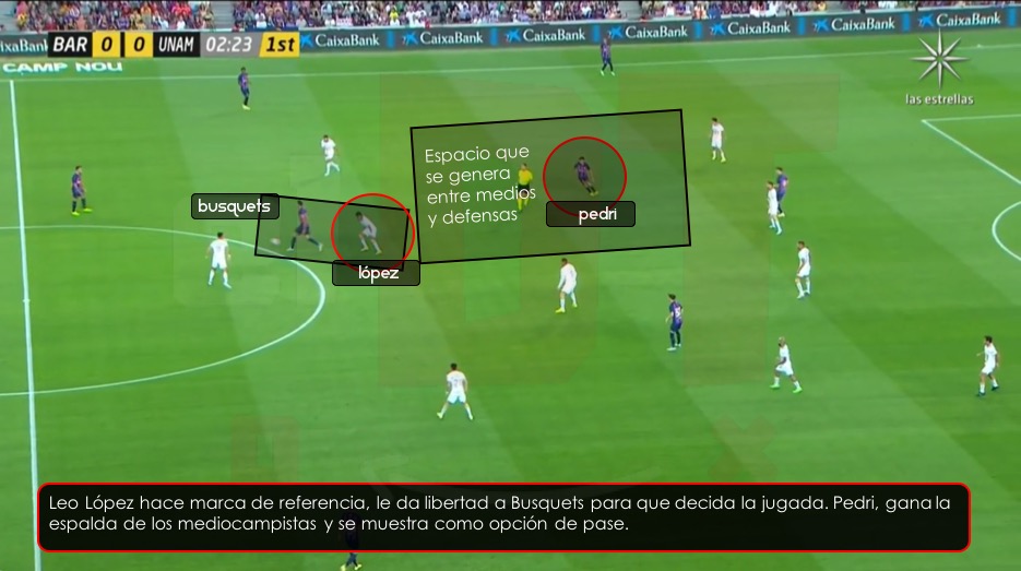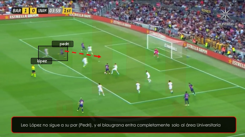 El primer gol del Barcelona se inicia en zona de construcción, es decir una vez que se superó la primera línea de presión de los Universitarios (Dinenno). Una vez en la segunda zona, Leo López salta de su posición y hace una marca de referencia, es decir, busca tapar línea de pase progresivo por pasillo central. Pedri, se posiciona sin marca entre la línea de mediocampistas y la de defensores, mostrándose como opción de pase progresivo.