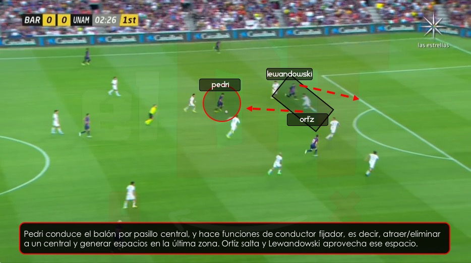 Una vez que Pedri tiene el balón en sus pies, busca hacer el rol de conductor fijador, esto con la finalidad de que un central salte de su posición y así atraer/eliminar a Ortíz , y que se genere espacio en zona defensiva. Posteriormente, Lewandowski hace un desmarque y Pedri manda el balón a profundidad.