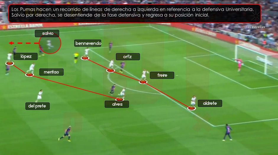 Cuando Pumas se vio mejor por lapsos de partido fue cuando hicieron ataque de posesión, con jugadores de muy buen pie como Leo López, Dani Alves, Del Prete y Salvio, el ataque de posesión es fundamental, ya que con los extremos interiorizados puedes ganar la espalda de los mediocampistas rivales y dejar las bandas a los laterales, provocando así ataque progresivo por pasillo central o por pasillos laterales.