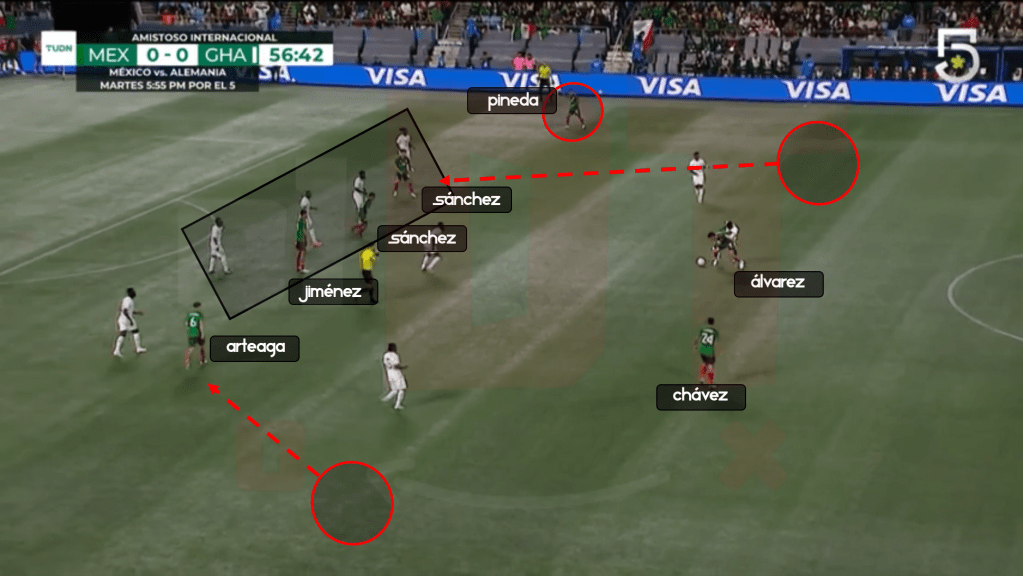 En fase ofensiva, en la zona de creación de juego, es decir ese momento en que se supera la primera línea de presión del rival, se buscaba generar igualdad numérica contra los 3 centrales de Ghana, ya que degfendía en bloque bajo con un 5-4-1, una opción era que los extremos Llozano y Pineda interiorizaran o bien que jugadores de segunda o tercera línea se incorporar por pasillo interiorlos extremos Hirving Lozano y Orbelín Pineda interiorizaban su posición para generar igualdad numérica ante los centrales de Ghana que defendían con un 5-4-1 en bloque bajo. O bien también