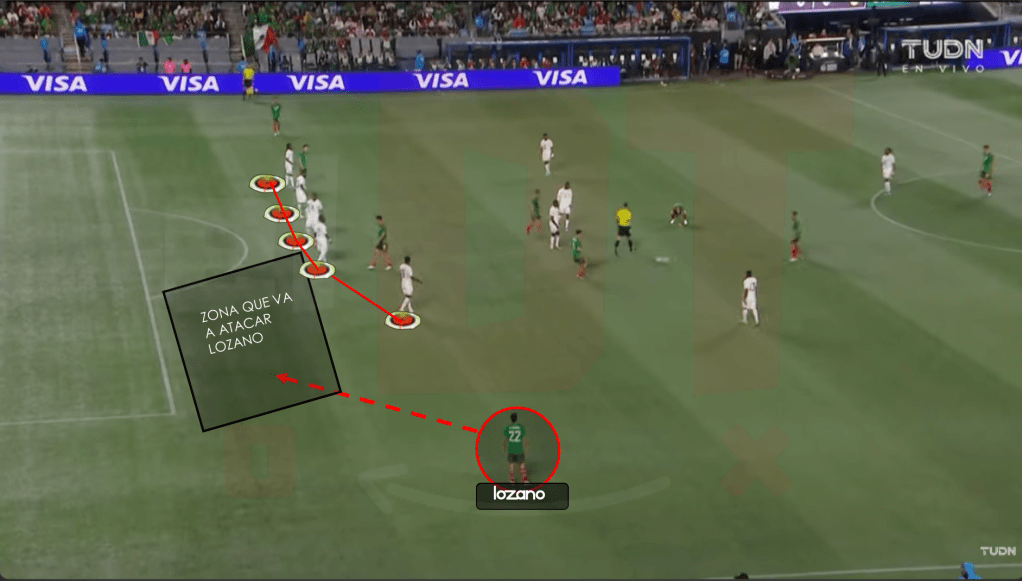 Hirving Lozano por banda izquierda con referencia al ataque mexicano, busca la amplitud. Pegado a la banda se aleja de la línea de defensores, eso le permite recibir sin marca el pase de Luis Chávez, y buscar así la diagonal de afuera hacia adentro, para posteriormente disparar a portería a primer poste.