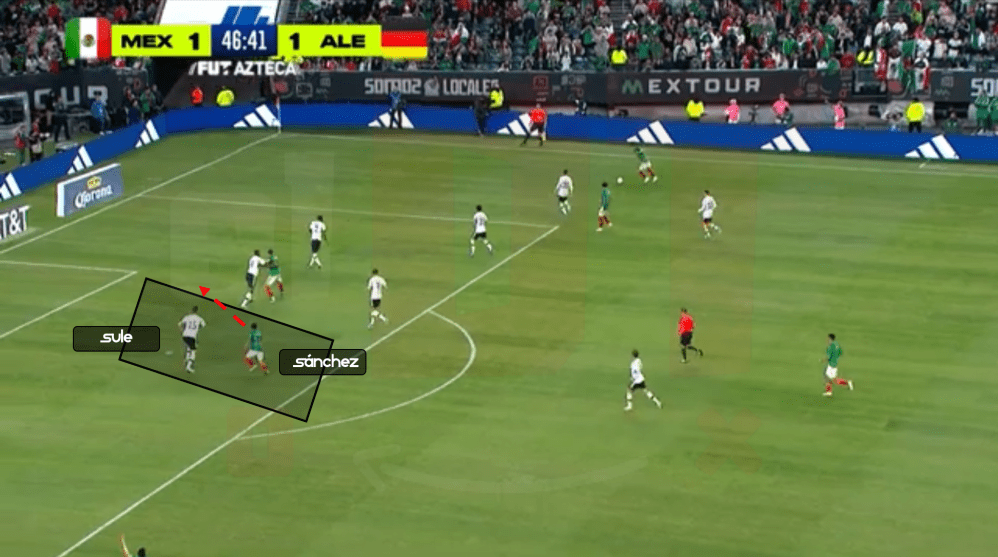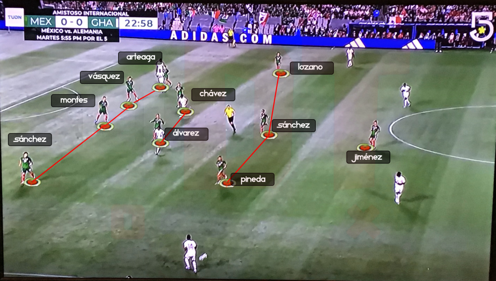 Poner a Erick Sánchez por detrás del centro delantero es para que en fase defensiva, sea Sánchez la primera línea de presión, que vaya y busque marcar a quien tome el rol protagónico en la salida del rival, puede ser algún central, o bien algún volante mixto, y dejar al centro delantero libre para la posible recuperación e iniciar la transición ofensiva. Y en zona de finalización, que se incorpore al ataque de segunda línea, algo parecido a lo que hizo en la pasada fecha FIFA contra Alemania, en el gol que marcó haciendo una anticipación a la ofensiva al central Sule.