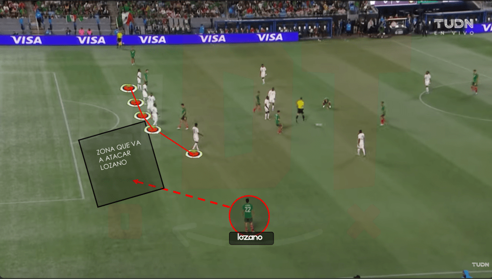 Utilizar a Hirving Lozano es para darle amplitud y profundidad al equipo, con esto se buscan dos objetivos, el primero: alargar la defensa rival, es decir que se pueda generar espacio entre lateral y central, y que ese espacio pueda ser aprovechado por incorporaciones de jugadores de segunda, e incluso de tercera línea. Y el segundo objetivo: Que ese espacio que se pueda generar lo ocupe Jorge Sánchez, que al menos en Selección, en Copa Oro, supo aprovechar/ocupar ese espacio y buscar profundidad incorporándose por pasillo interior.