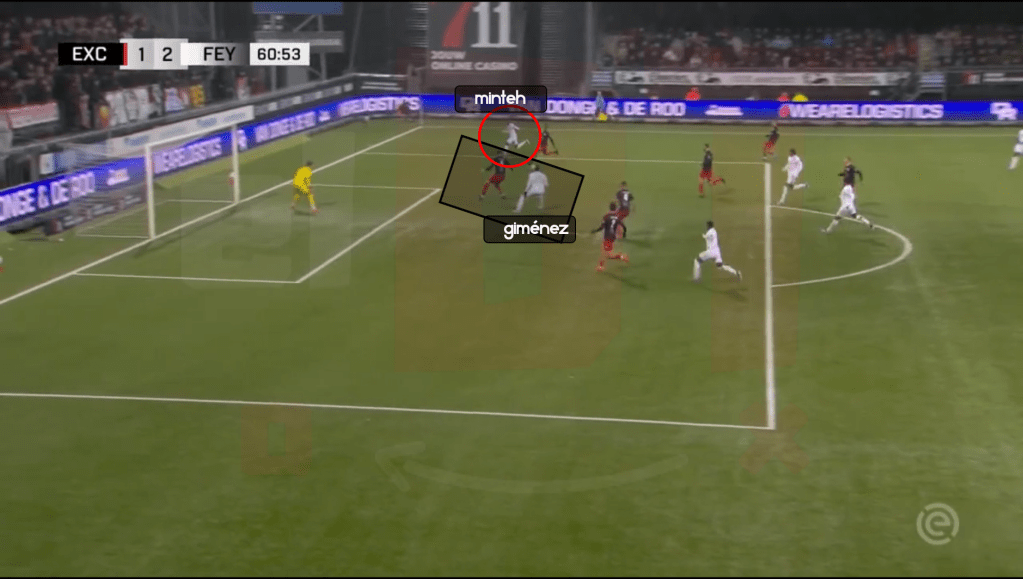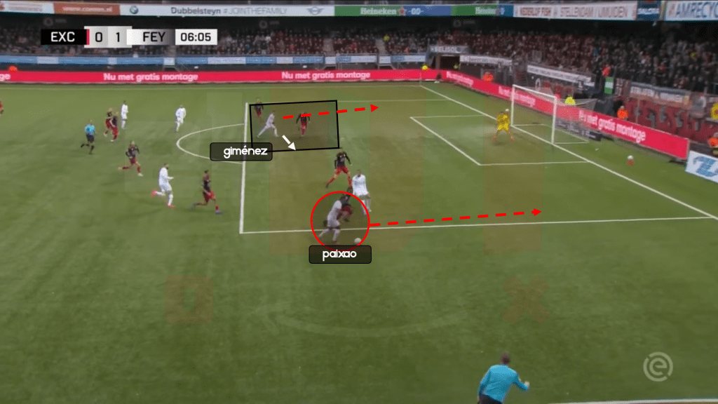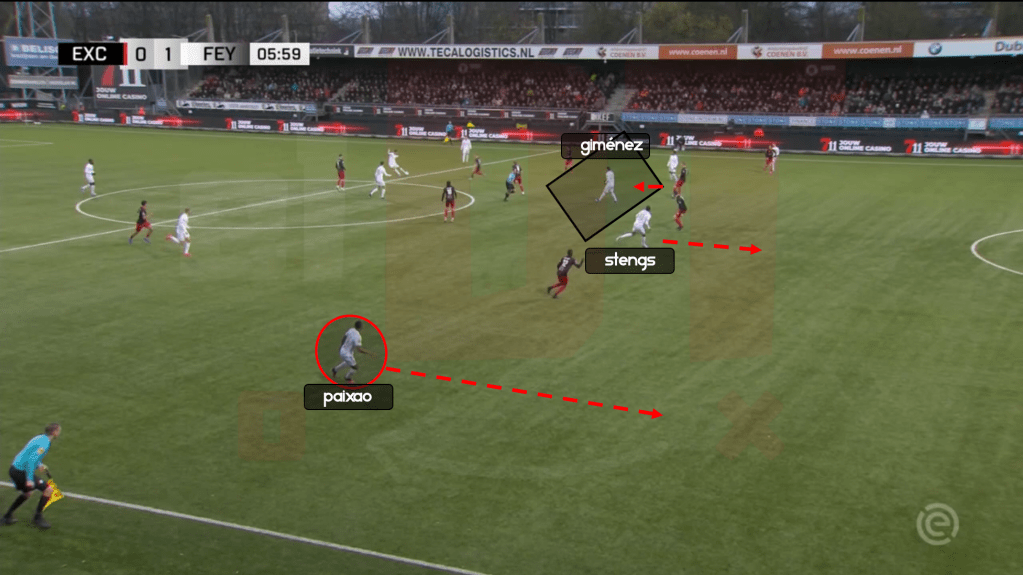 La jugada del primer gol contra el Excelsior inicia con el central Hancko tomando el rol protagónico en fase ofensiva en zona de inicio de juego. Santi Giménez, hace un desmarque de apoyo para ser opción de pase progresivo por pasillo central, con él, atrae la marca de un defensor, generando espacio en zona más avanzada del campo, que puede ser aprovechada por Stengs. Por pasillo lateral derecho, en referencia al ataque del Feyenoord, está Paixao, dándole amplitud al equipo, y buscando alargar la defensa rival.