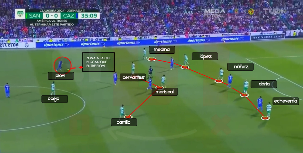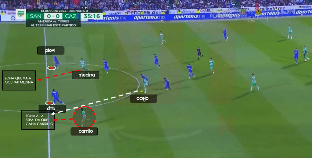 En la jornada 11, cuando los comandados por Martín Anselmi enfrentaron a Santos, se vió una jugada muy parecida a la que anteriormente explicamos. Santos ahora decide defender en bloque medio/bajo, prácticamente con línea de 5 en el fondo, es el mediocampista por derecha Medina, quien baja para formar esa línea de 5. Santos busca que Piovi haga una conducción y entre a la zona marcada para atraer/sacar al bloque del Cruz Azul. Una vez que Piovi entra en esa zona, Santos empieza a realizar una presión más intensa, siendo Medina quien recupera el balón y sirve para Ocejo, quien hace un desmarque de apoyo y posteriormente abre el balón a Carrillo, garantizando así el juego progresivo de Santos.
